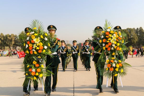 祭奠仪式上,全体师生队列整齐、神情肃穆,在庄严的国歌声中,向革命先烈默哀一分钟。国旗护卫队迈着坚定的步伐走到广场中央为烈士们敬献花圈。随后,团员青年们面对鲜艳的中国共产党党旗和中国共产主义青年团团旗,高举右手,紧握右拳,重温入团誓词。