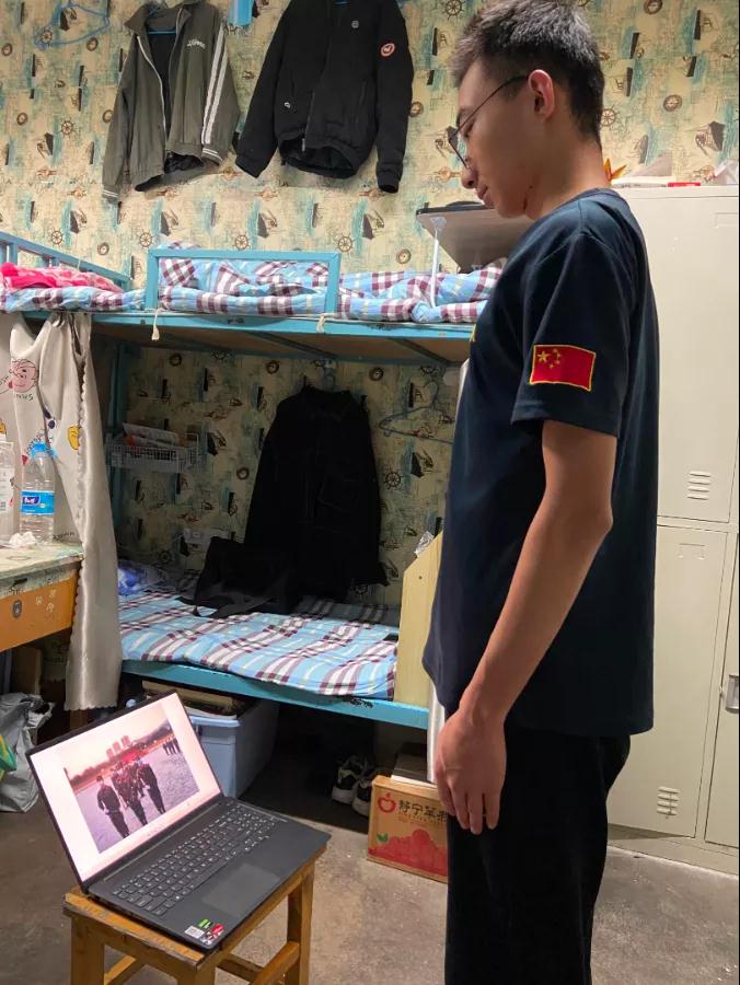 国旗护卫队护旗手安东宁说:“受疫情影响,学校封闭管理,国旗护卫队在南校区生活学习的同学,自觉把每周一早晨都做的事情,用另外一种方式继续进行。”