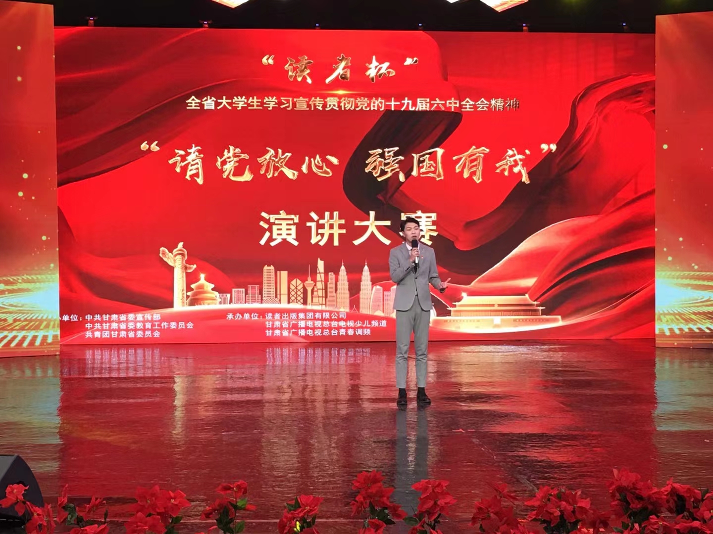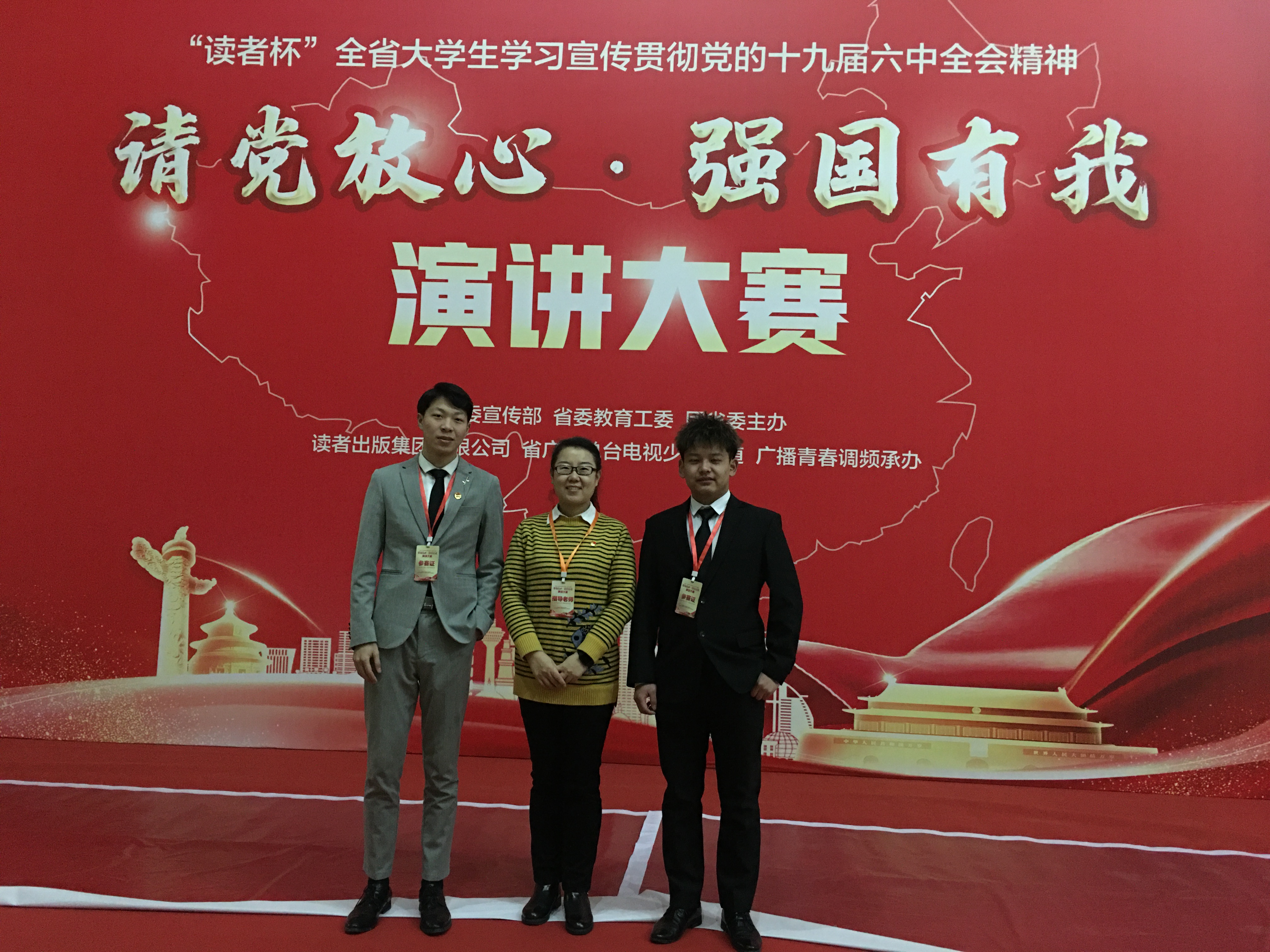 12月28日-29日,“读者杯”全省大学生学习宣传贯彻党的十九届六中全会精神“请党放心 强国有我”演讲大赛决赛在甘肃省广播电视总台演播大厅举行。经过激烈地角逐,我校谢慧磊同学的作品《峥嵘百年 与党同行》荣获二等奖,王吴骏同学的作品《五星闪耀 我辈信仰》荣获三等奖,李雯娟荣获优秀辅导老师奖。