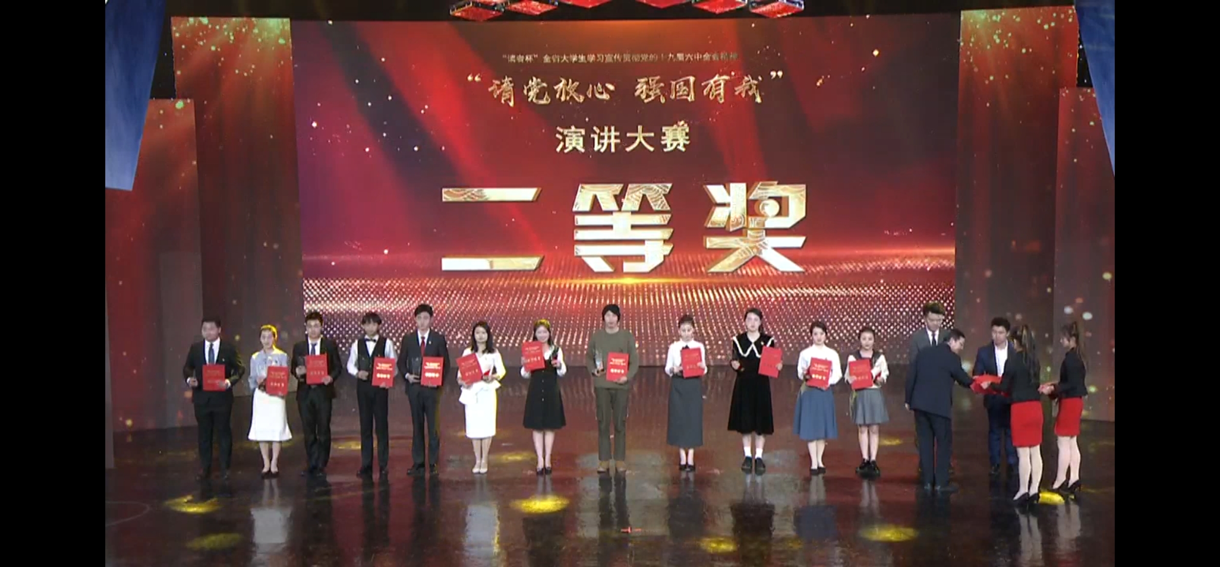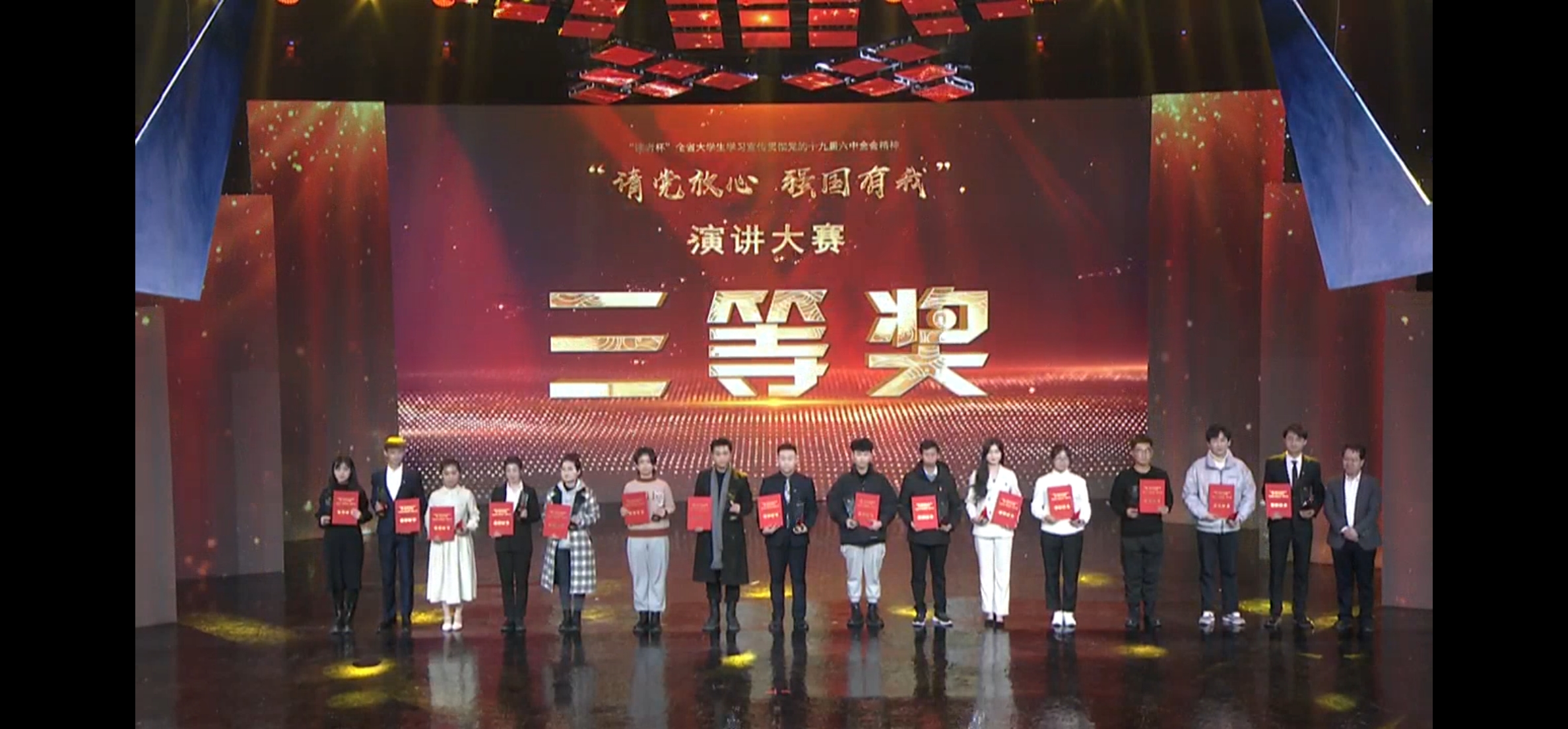 大赛分高校初赛、全省复赛及总决赛3个赛程。我校于12月16日组织举办了校级初赛,经评审打分推选2个优秀作品参加全省复赛。全省复赛以视频方式集中参赛,经过12月22日-24日专家评委的紧张评审,来自32所高校的50个演讲作品从初赛90个入选作品中脱颖而出,总决赛以现场比赛的方式进行,同学们通过不同的演讲作品深情回溯了中国共产党百年波澜壮阔的历史征程,并立足自身实践讲述了青年为中华民族伟大复兴贡献青春智慧的实际行动和美好愿景,共同发出“请党放心 强国有我”的铿锵誓言。