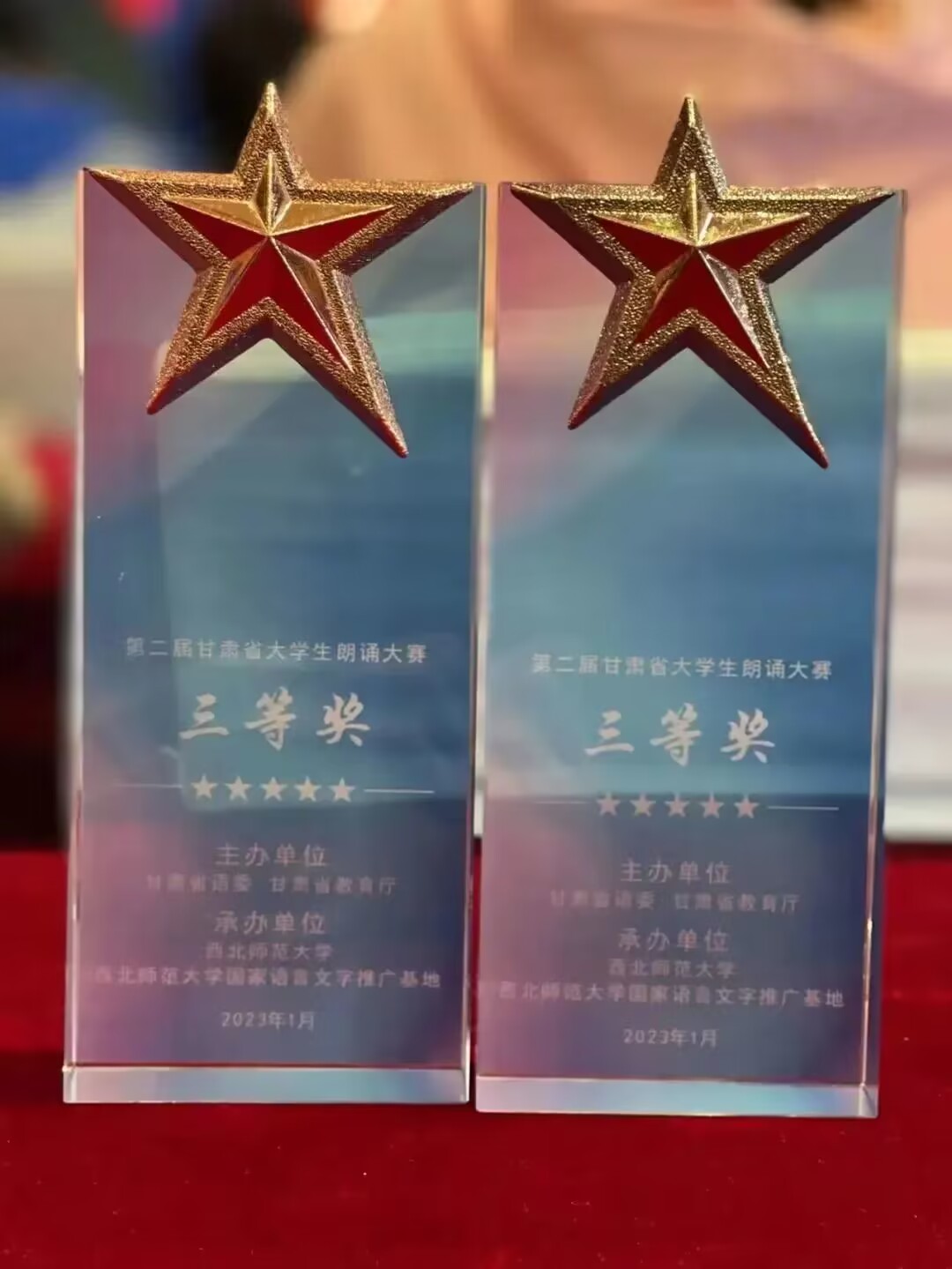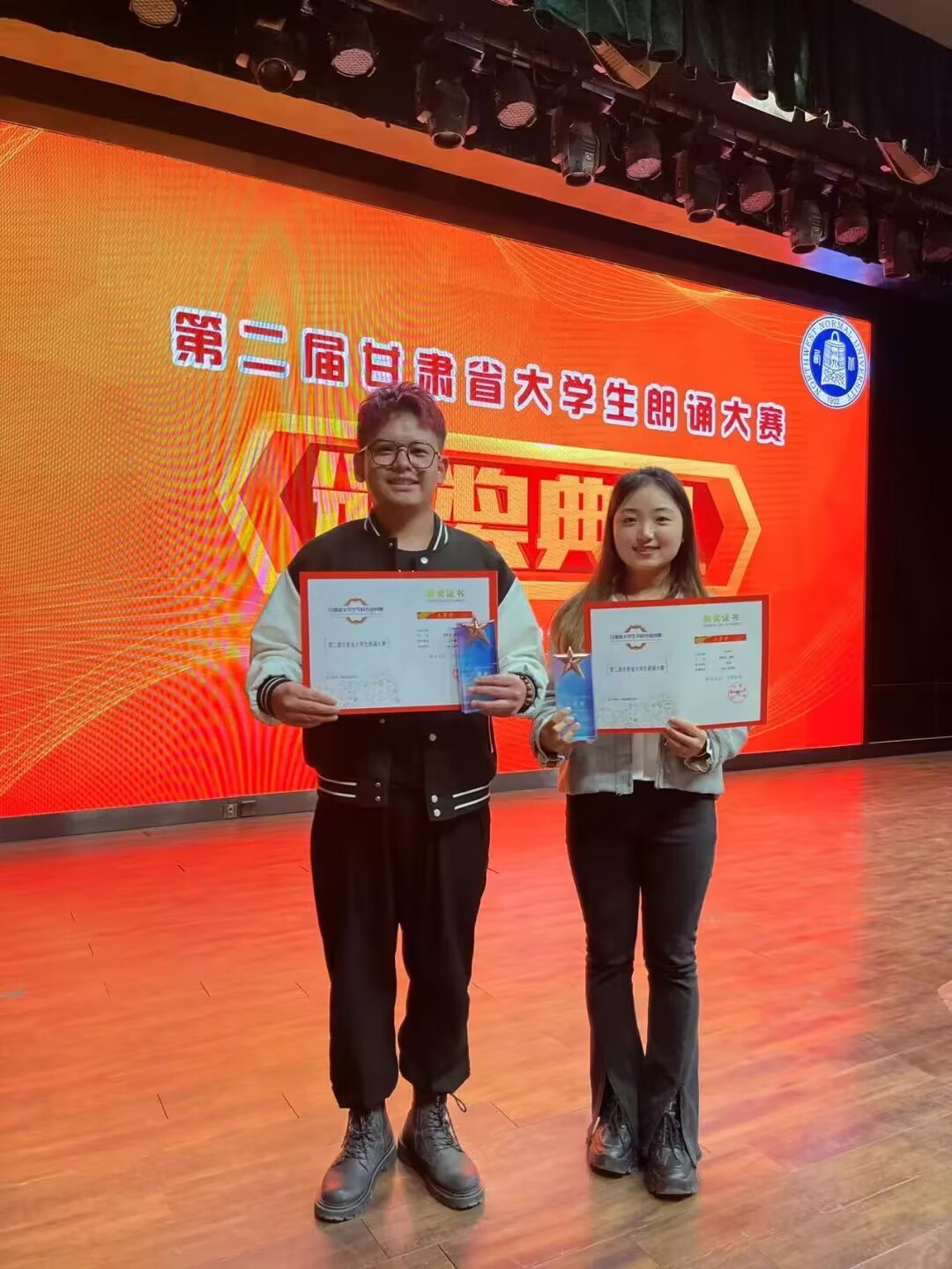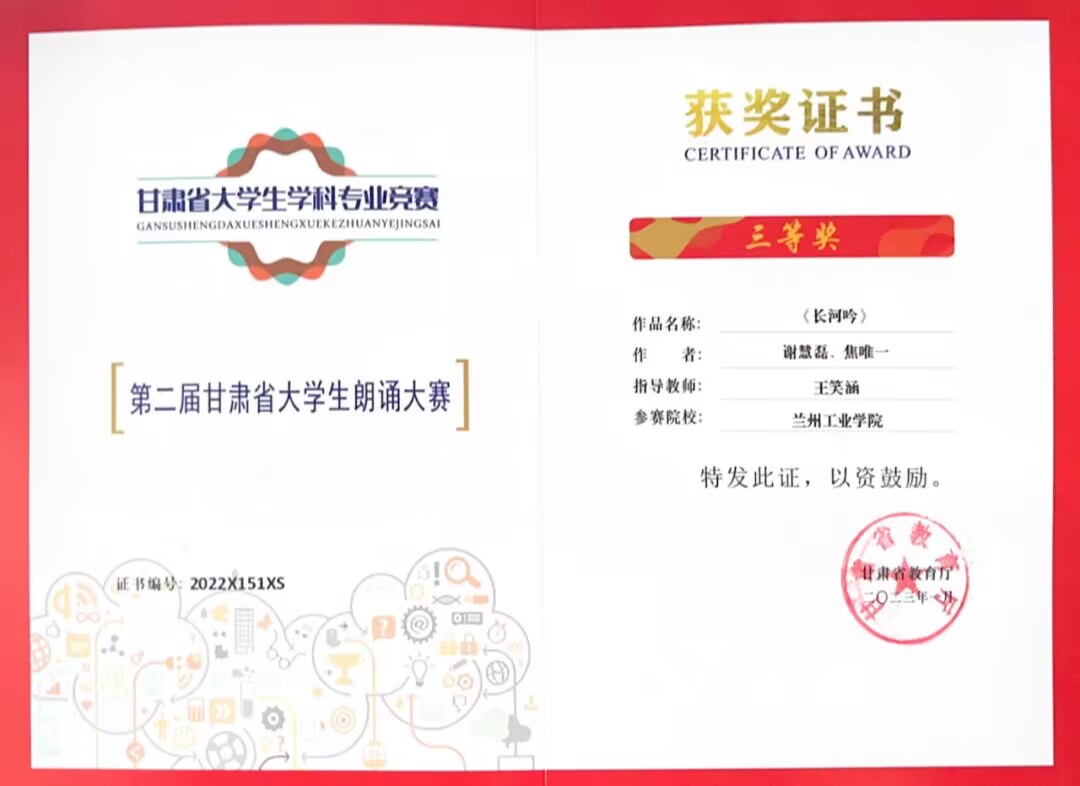 本次“雅言诵经典,永远跟党走”2022年第二届甘肃省大学生朗诵大赛由甘肃省教育厅主办,西北师范大学承办。我校通过校内选拔赛评选出前三名参加省级比赛。省级比赛共有从兰州大学、西北师范大学、兰州交通大学等19所高校遴选出的27部作品入围。决赛由甘肃省朗诵协会主席于芳、甘肃省朗诵协会副主席临溪、甘肃省网络作协副主席赵武明、甘肃演艺集团话剧院副院长、艺术总监郁海滨、《甘肃新闻》栏目播音员马龙飞、甘肃广播电视总台著名主持人王建萍、西北师范大学播音与主持艺术系教师王国力担任评委,经各位评委严格评选、线上打分,共评出等级奖项17项,其中我校谢慧磊和焦唯一同学朗诵的作品《长河吟》荣获省级三等奖。