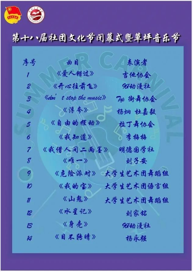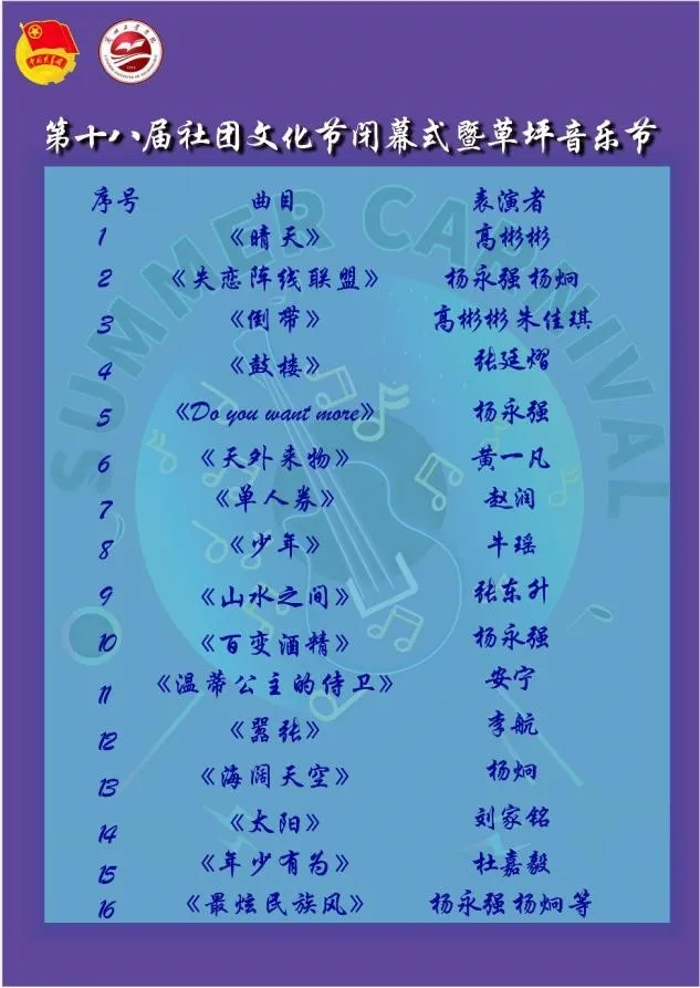 近日,我校第十八届学生社团文化节圆满落幕。在为期一个半月的学生社团文化节期间,学校各类学生社团结合自身特点,开展了创新创业、文体竞技、志愿服务、环保实践等一系列丰富多彩的学生社团活动。为进一步引导和激励学生社团在今后的学习和工作中取得新的成绩,5月16-17日,学校在南校区运动场举行第十八届学生社团文化节闭幕式暨草坪音乐节。