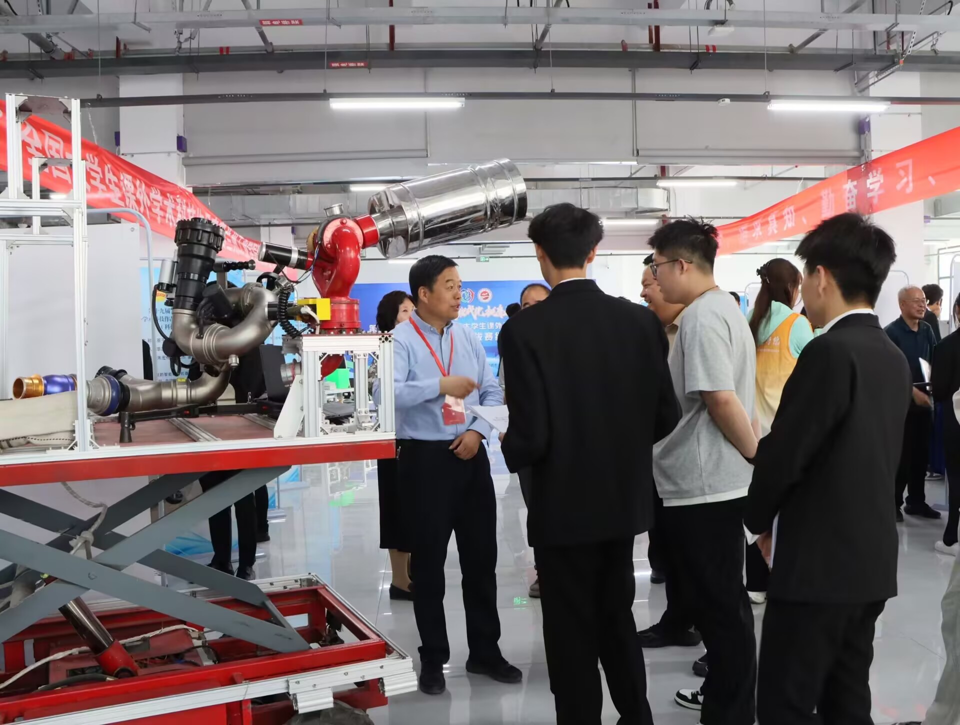 开幕式后,校领导与12位评审专家共同参观校赛终审决赛展示。校级终审决赛采用项目展示和公开答辩相结合的方式进行。科技发明制作类各参赛团队利用展板展示、实物演示、现场实验,对项目的研究背景、设计思路、构造原理、创新优势等方面进行陈述,哲学社科类参赛团队公开答辩,专家评委从材料规范性、选题时代性、作品创新性、调研数据支撑、应用成熟度等方面对项目进行考察。陈述答辩环节参赛队员们情绪饱满、语言流畅、思维清晰,展现出良好的综合素养。评审专家围绕项目科学性、先进性和实用性等方面进行了重点提问,并结合项目实际给出了针对性指导。