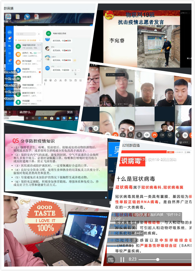 通信19-1团支部学习了习近平总书记关于疫情防控工作的系列重要讲话精神,围绕公共卫生事件中青年群体的责任与担当展开了大讨论,勉励大家勇于担当、保持奋进、与祖国和人民同呼吸共命运;测控18团支部讲述了90后抗疫医务人员的故事,分享了疫情期间参加抗疫志愿服务同学的先进事迹,号召团员青年向英雄学习,勇担时代使命;软件19-2团支部通过观看抗击疫情宣传片,回顾抗疫英雄的壮举,感受抗疫过程的艰辛和人民英雄的伟大,呼吁团员青年传播正能量,弘扬主旋律,坚定理想信念,用实际行动发挥能量,与祖国同呼吸共命运;汽服19团支部团员青年纷纷表示,在抗疫过程中深刻感受“一方有难、八方支援”的中国精神,“快速反应、分秒必争”的中国速度,“万众一心、众志成城”的中国力量;给排水19团支部通过防疫知识竞答方式,组织团员学习防疫知识,增强防疫意识,提升防疫能力,坚决做到抗疫关键时期不松懈、不懒散、不添乱。