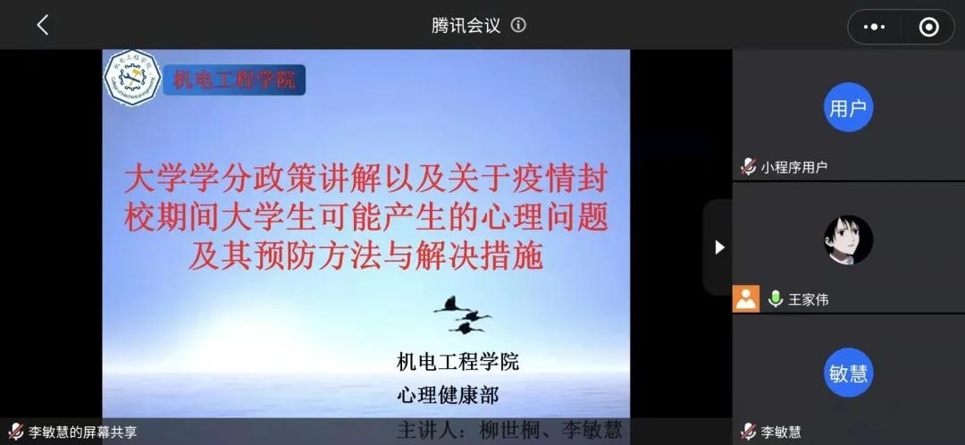 疫情期间为了增强大学生心理素质,促进大学生心理健康良好的发展以及让大家进一步了解我校学分政策,机电工程学院于2021年11月19日晚上七点在腾讯会议组织开展《学分政策及心理健康》专题讲座。机电工程学院学工办主任马青丽老师、机电工程学院团委书记张胜军老师以及2021级全体同学参加此次讲座,机电工程学院学生会主席团成员王家伟主持此次讲座,机电工程学院学生会心理健康部柳世桐、李敏慧担任此次讲座的主讲人。