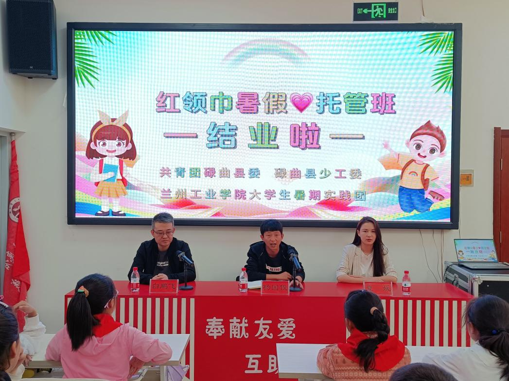 结业仪式上,团县委书记杨国俊对七彩假期暑期社会实践活动进行了总结讲话,讲话充分肯定了志愿者们教学成果与工作热情,对志愿者们言传身教、严谨学风及求索之风予以高度赞赏,并表示本次社会实践丰富了当地少年儿童的暑期生活,解决了双职工家庭和特殊困难家庭暑期子女“照护难”的问题,希望以此次活动为契机,继续加强学校与碌曲之间的合作。