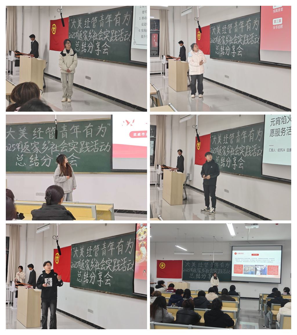 3月3日晚,经济管理学院在公共教学楼C108举行2025年寒假“返家乡”社会实践总结表彰会,分享展示青年大学生寒假返回家乡开展社会实践的心得体会,学院分团委书记和学生代表参会。