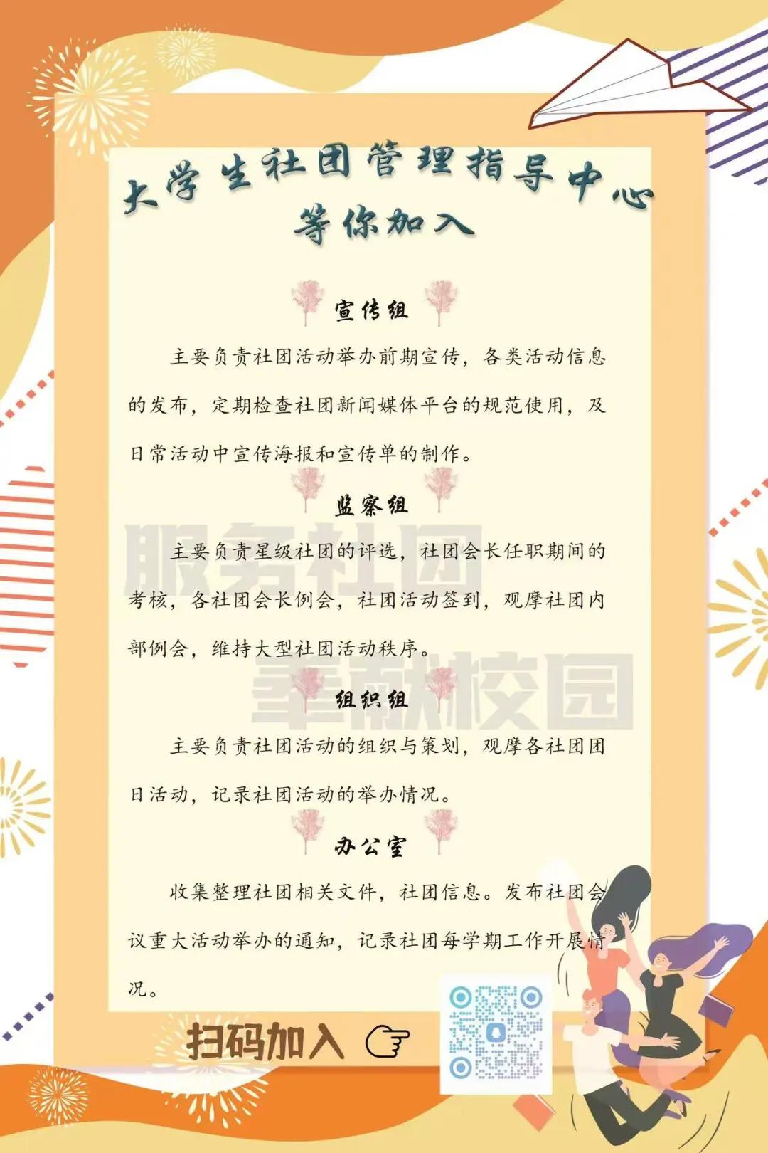 大学生社团管理指导中心:服务社团发展,搭建兴趣平台,激发创新活力。
