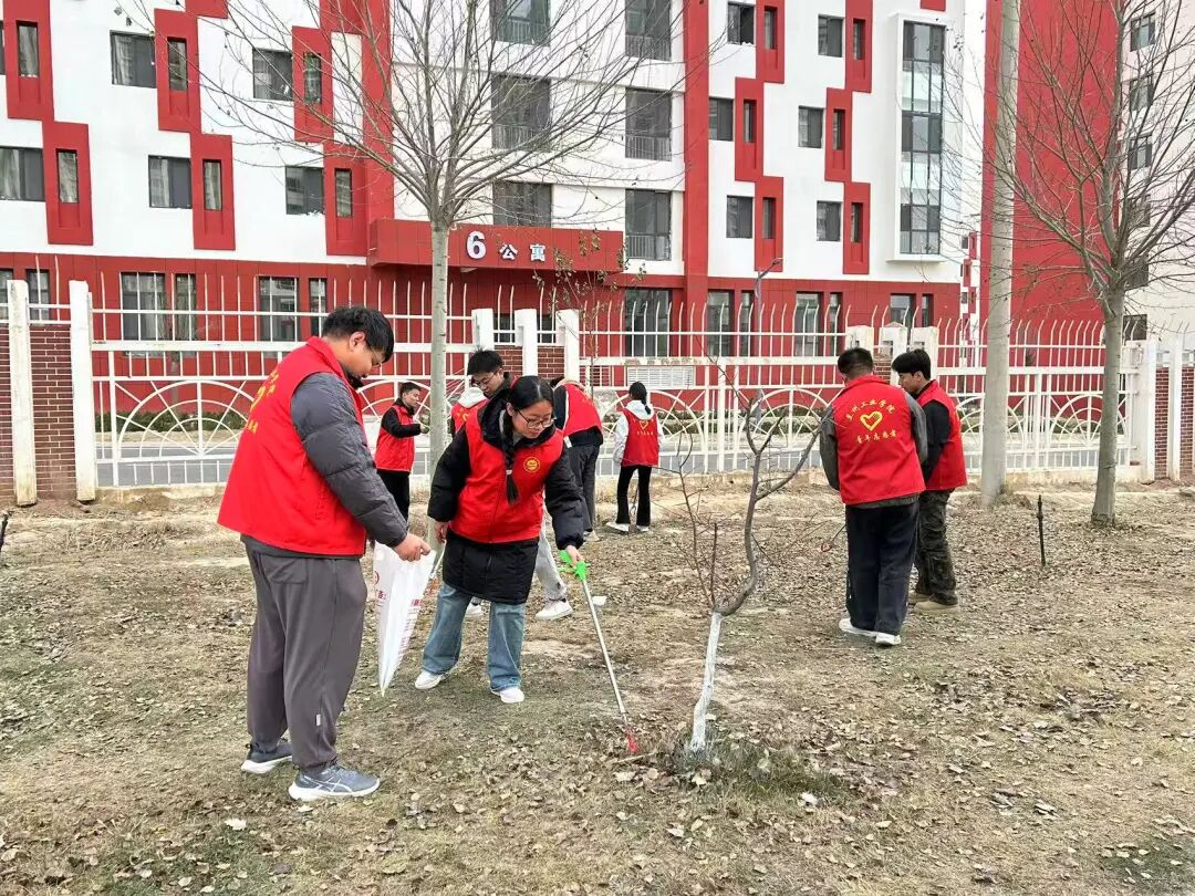 活动现场,学院党委充分发挥党建引领作用,构建“党员带头、团员紧跟、骨干示范”的工作格局。师生党员冲锋在前,带领团学骨干分工协作、默契配合:有的手持扫帚、铁铲清理社区公共区域的生活垃圾、落叶杂草,有的细致擦拭宣传栏、健身器材等公共设施,有的重点整治墙角、绿化带等卫生死角,全力清除环境“顽疾”。志愿者们不怕脏、不怕累,以饱满的热情和务实的作风,让社区及周边环境焕然一新,赢得社区工作人员和居民的一致好评。