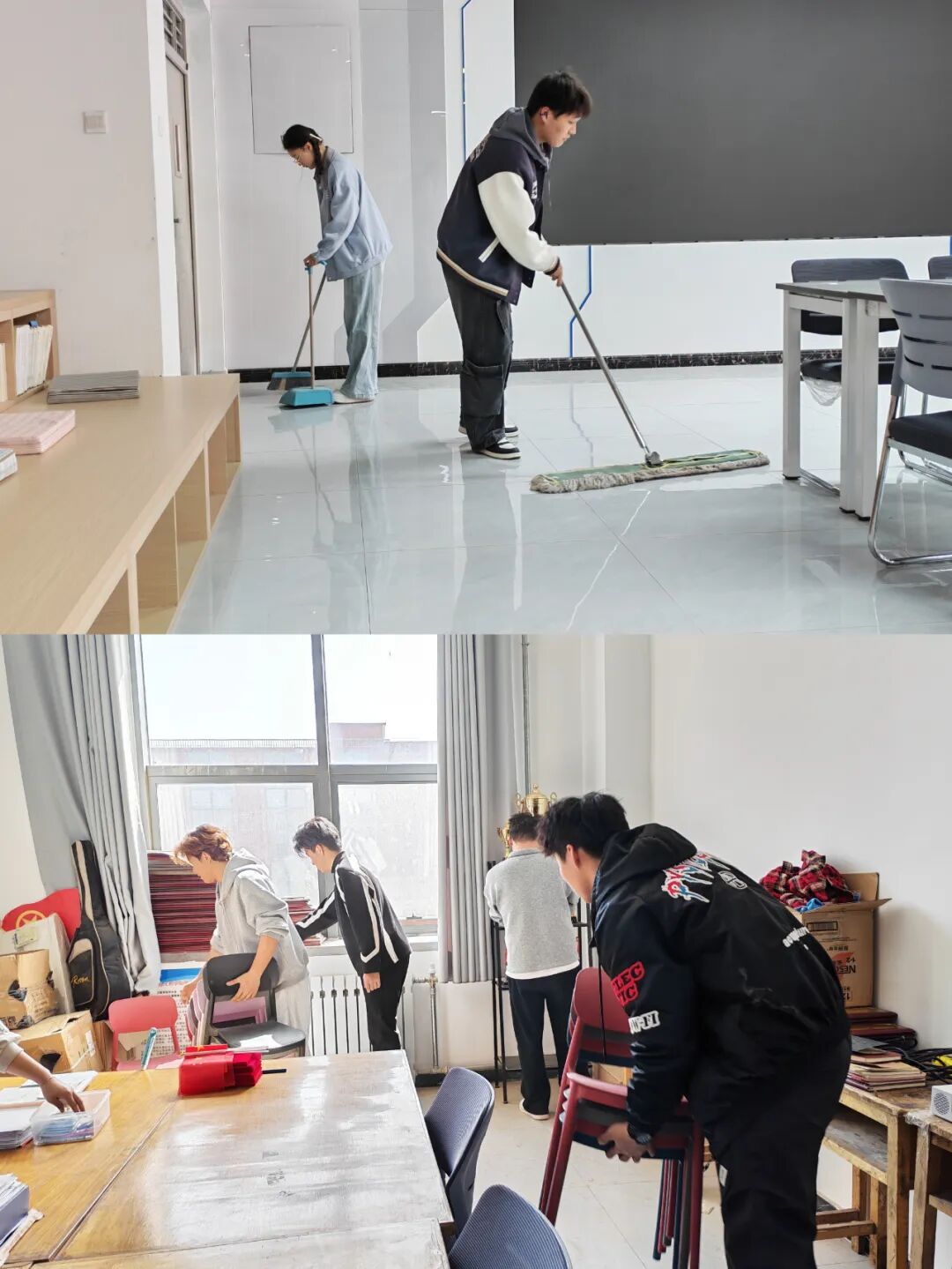 3月5日,学院组织学生在南北校区分两组开展志愿服务活动。第一组同学对学院办公室、实验室及楼道公共区域进行清扫保洁,第二组同学对教室、图书室书籍进行分类整理。大家以实际行动投身文明校园建设,为广大师生营造整洁、优美、舒适的办公与学习环境。