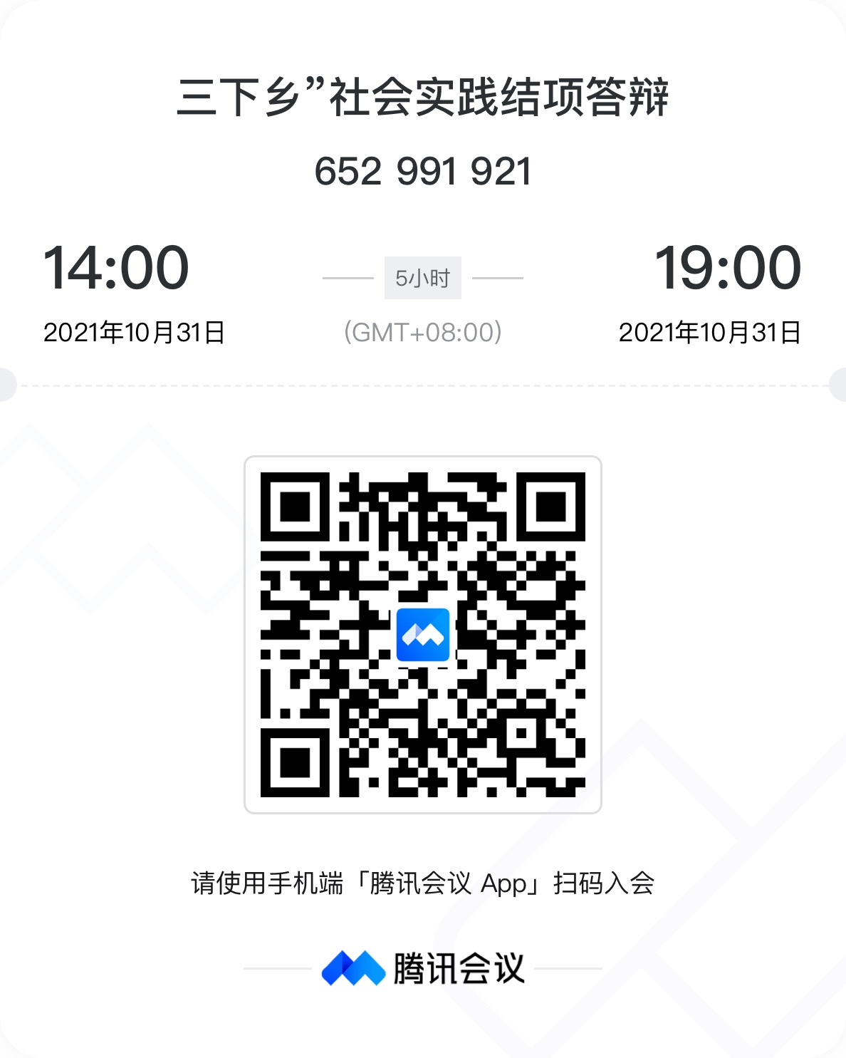 线上答辩。请参与社会实践活动团织、实践团队和个人提前准备,答辩人在电脑端下载“腾讯会议APP”,入会号码:652991921(或扫描下方二维码进入会议),会议密码:666666。