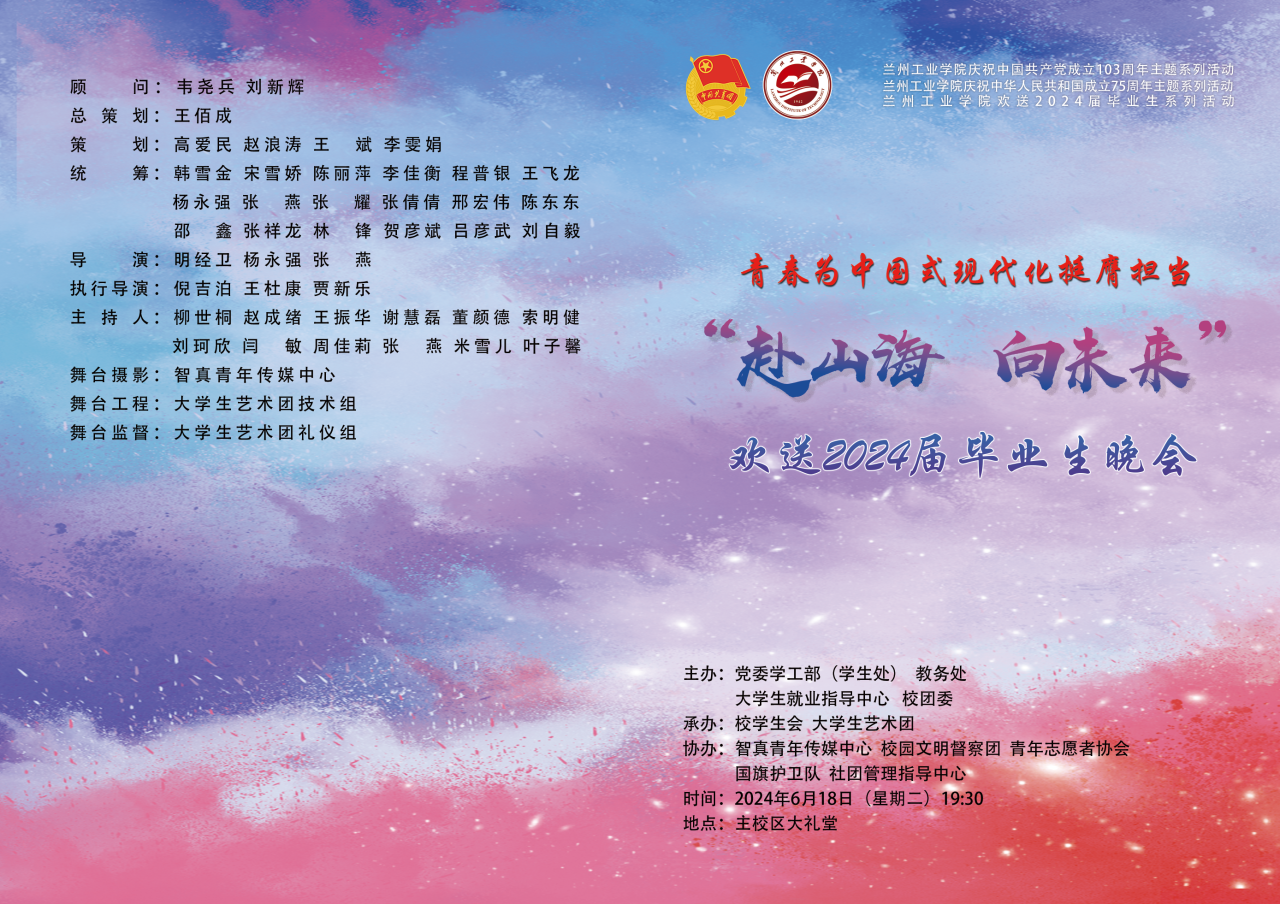 为庆祝中华人民共和国成立75周年、庆祝中国共产党成立103周年的到来,进一步加强学校人文素养及美育教育的提升发展,提高高雅艺术校园文化品位,学校将于2024年6月18日19:30在北校区大礼堂(食堂三楼)举行赴山海 向未来——兰州工业学院2024年“欢送毕业生晚会”。