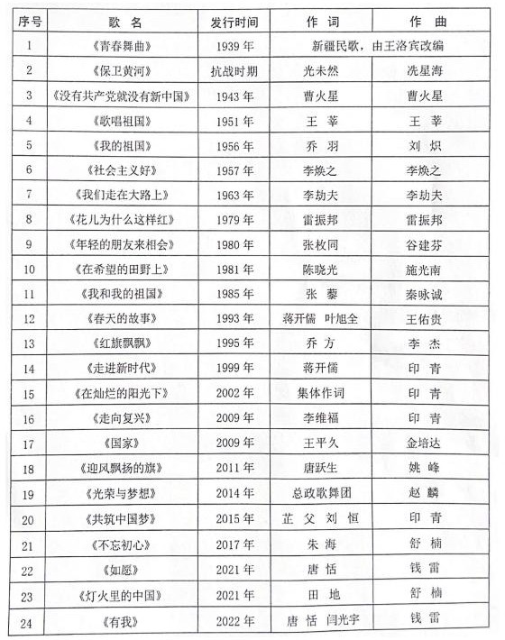2. 曲目。每支合唱团须演唱两首曲目,一首为规定曲目 (附件 1 任选其一),要求必须是歌颂党和祖国、歌唱新时代的中国合唱作品,至少有两个声部以上;另一首为自选曲目,两首曲目合唱总时长不超过 8 分钟。
