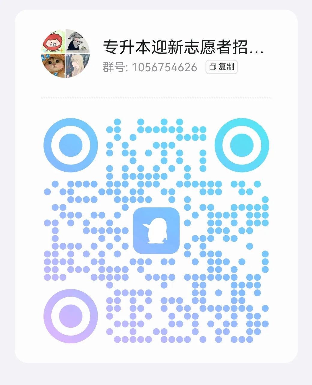 有意向参与的同学请于8月1日之前,扫描二下方二维码加入兰州工业学院2025年迎新志愿者招募QQ群:1056754626。在群内通知后续工作安排及相关活动通知,入群后及时查看群消息、务必按照“年级-专业-姓名-联系方式”的格式修改群昵称,一遍后续沟通联系。