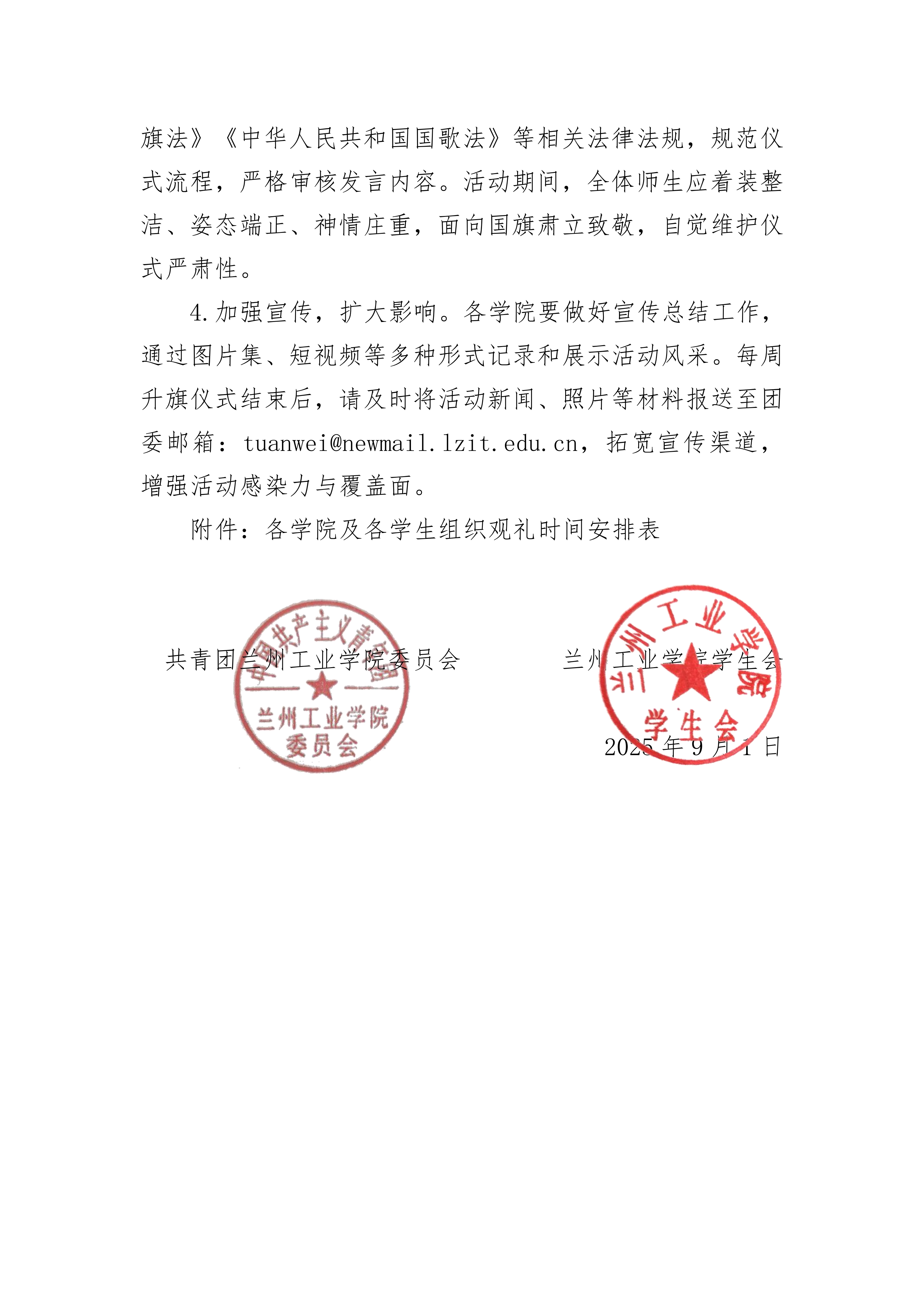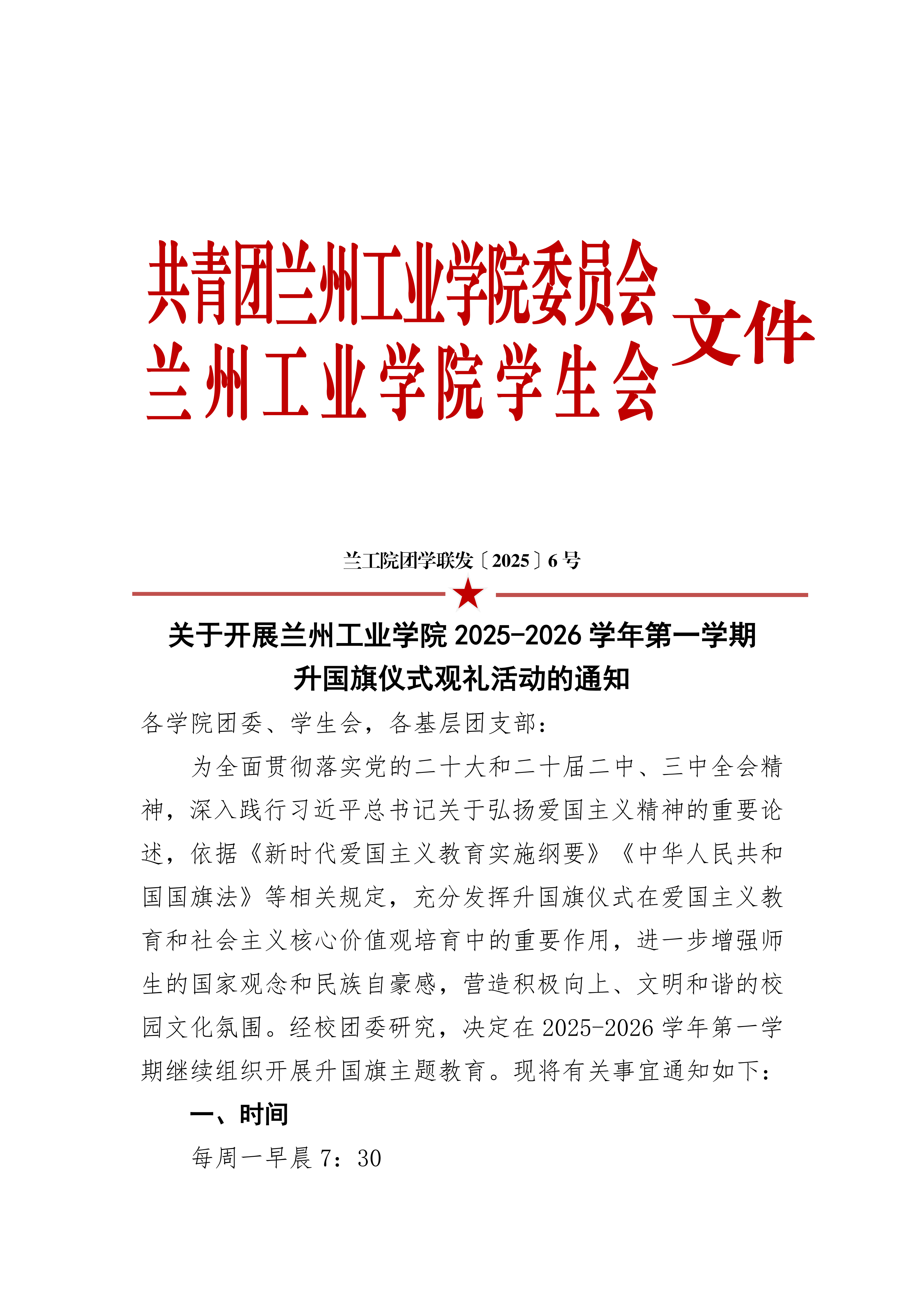 关于开展兰州工业学院 2025-2026 学年第一学期升国旗仪式观礼活动的通知
