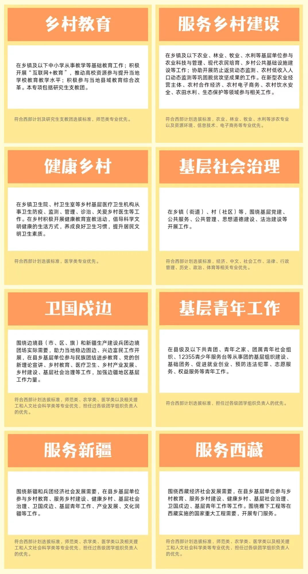 2026年西部计划项目将深入贯彻落实习近平总书记重要回信精神,引导广大高校毕业生积极参加乡村教育、服务乡村建设、健康乡村、基层社会治理、卫国戍边、基层青年工作、服务新疆、服务西藏等8个专项,以青春力量服务国家战略、服务百姓民生、服务社会治理。今年全国预计新招募约6万人,赴新疆、西藏等27个省(自治区、直辖市)和新疆生产建设兵团的基层一线开展志愿服务,90%以上的服务岗位在乡镇及以下。西部计划志愿者服务期为1至3年,服务协议一年一签。为激励志愿者服务期满继续扎根西部、扎根基层,国家在升学、就业、培养等多个方面给予政策支持。