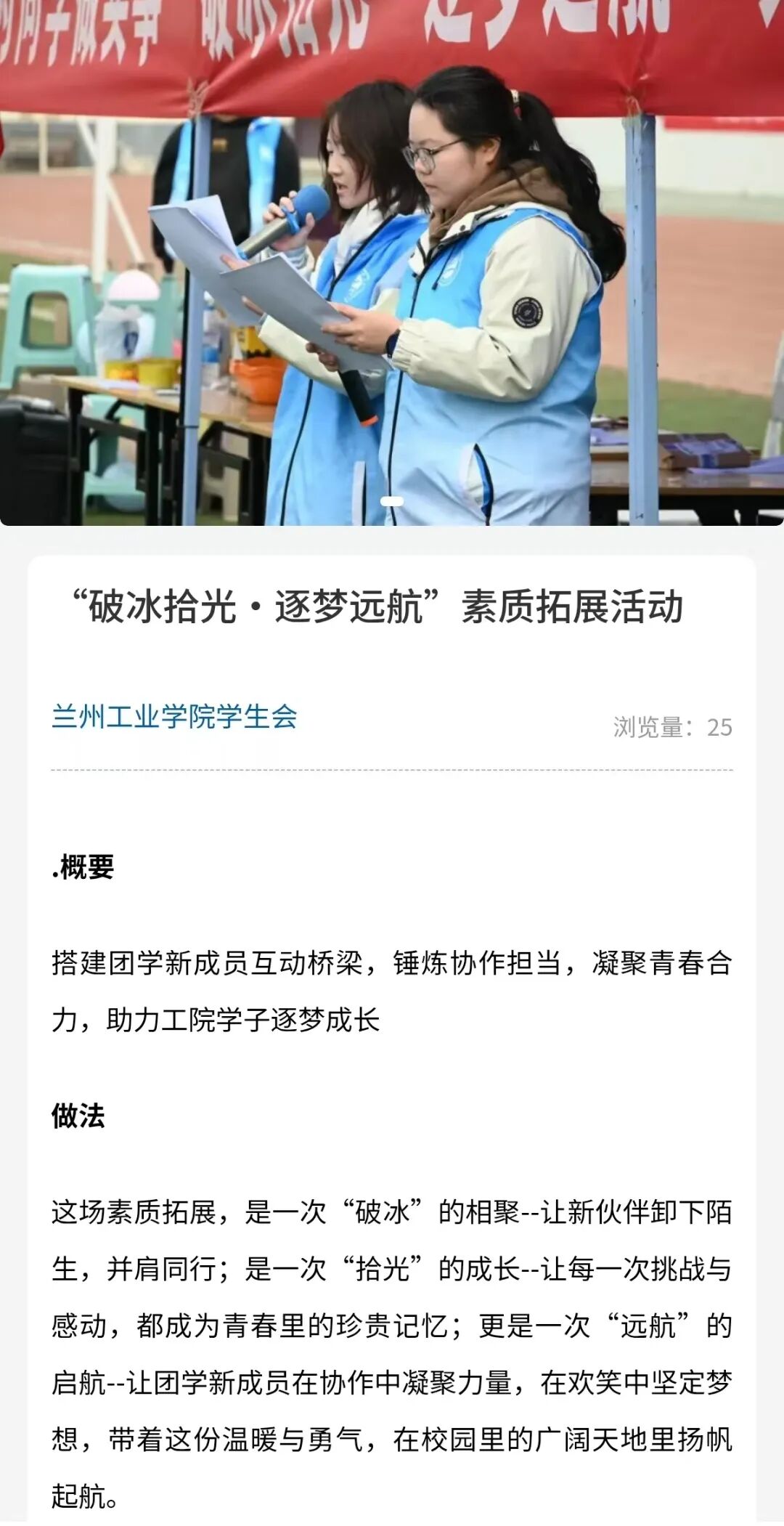 这是一次“破冰”的相聚,让新伙伴卸下拘谨、并肩同行;是一次“拾光”的成长,让每一次协作挑战、每一份真挚感动,都成为青春里的珍贵印记;更是一次“远航”的启航,让工院学子在携手奋进中凝聚力量,在欢声笑语中坚定梦想。