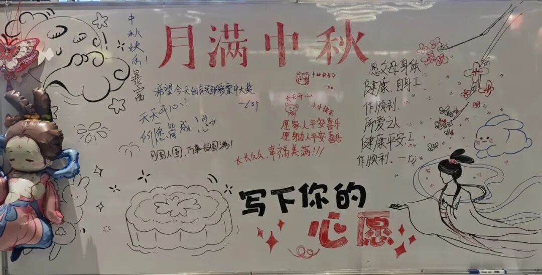 来到“月满中秋情”的心愿板前,同学们手持白板笔,将对家人的思念、对朋友的祝福、对自己的期许一一写下。悠扬的《花好月圆夜》旋律萦绕现场,一句句真挚话语、一个个暖心笔迹,汇聚成工院中秋夜最动人的风景,让节日的温暖直抵人心。