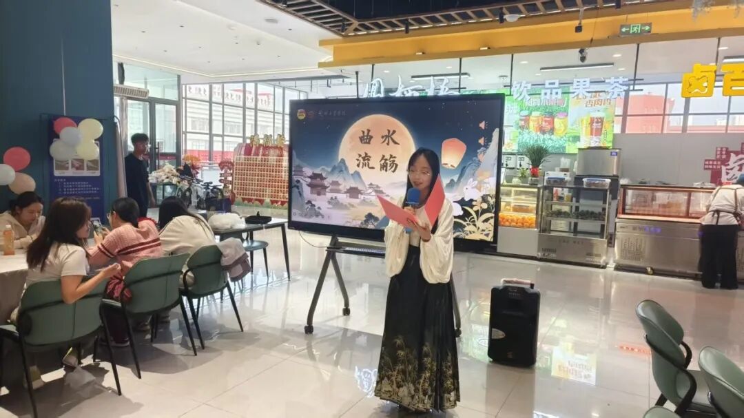 活动现场两大趣味环节人气爆棚——“曲水流觞”间,同学们循着歌曲的韵律诵读中秋诗词,在经典词句的流转中深化文化认同感;“猜灯谜”区里,大家围站灯前巧思冥想,在谜底揭晓的瞬间收获智慧与启发。此起彼伏的欢声笑语里,同学们在沉浸式的体验中,真切触摸到传统文化的独特魅力。